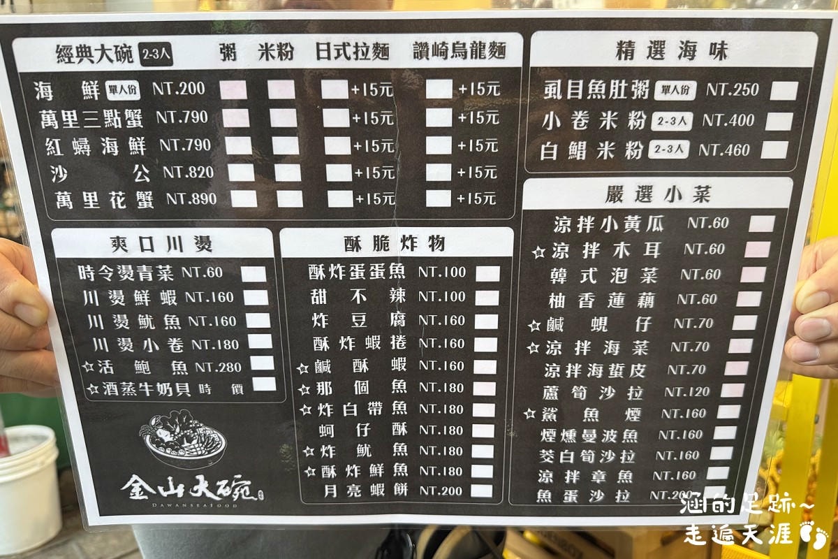 金山大碗螃蟹主打的就是海鮮粥,有海鮮、萬里三點蟹、紅蟳海鮮、萬里花蟹,可以選粥、米粉、烏龍麵、拉麵,也有虱目魚肚粥、鮮蚵粥、小卷米粉、白鯧米粉。只有$200元的海鮮是單人份,萬里三點蟹、紅蟳海鮮、沙公、萬里花蟹都是2-3人份。