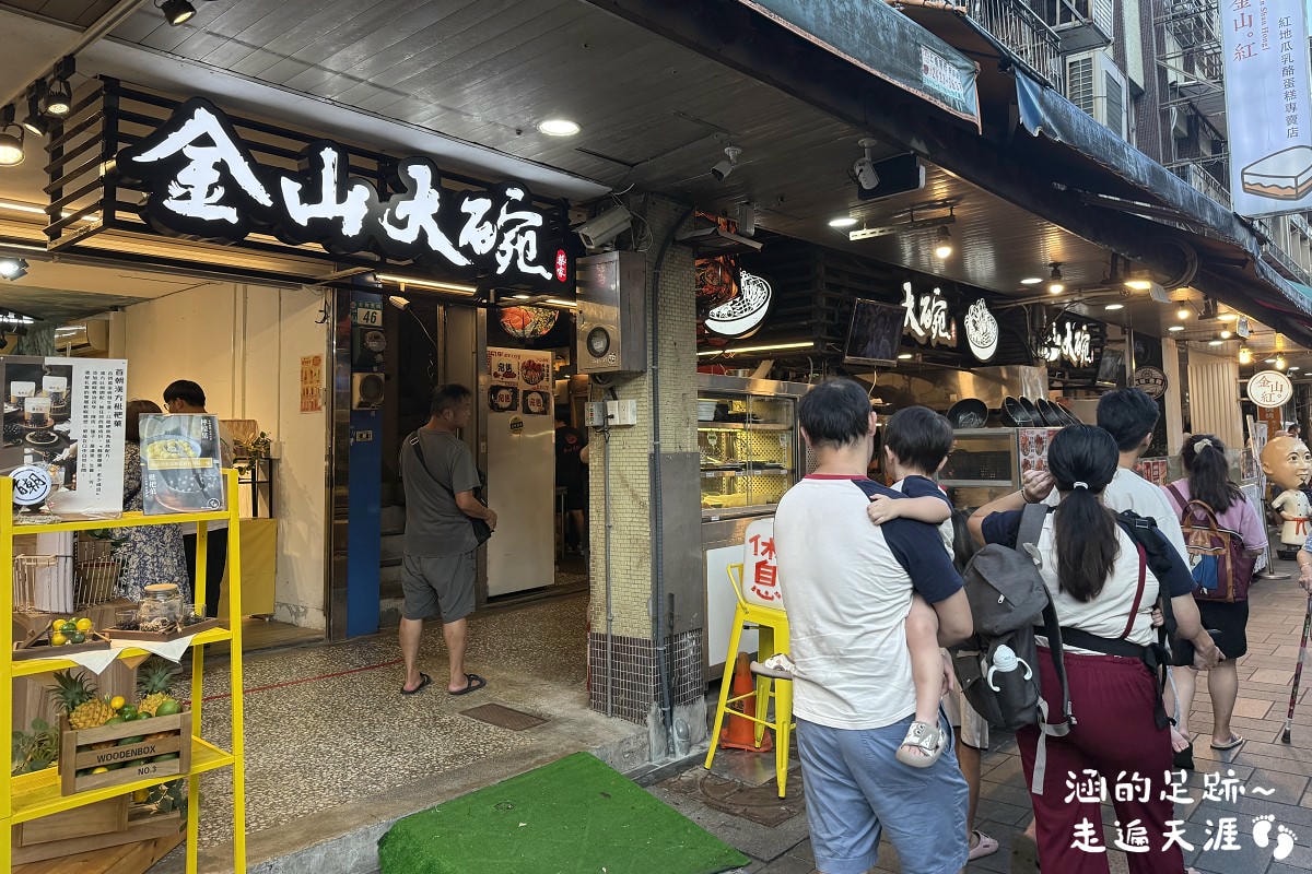 小涵是星期六晚上6點左右到,這時白天熱鬧的金山老街已經有很多攤位在收攤了,而金山大碗螃蟹門口仍是長長一條排隊的人龍。好在可能因為時間晚了,許多人都吃完出來,前進的速度還算快,我們大約排了10幾分鐘就有位子了。如果是假日白天,可能要排一個小時才能吃到。