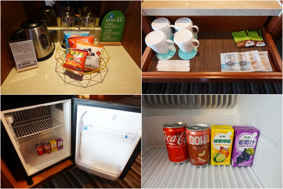 mini bar上的餅乾、冰箱裡的飲料都是免費招待,餅乾還有淡水知名伴手禮,登峰的蝦酥。