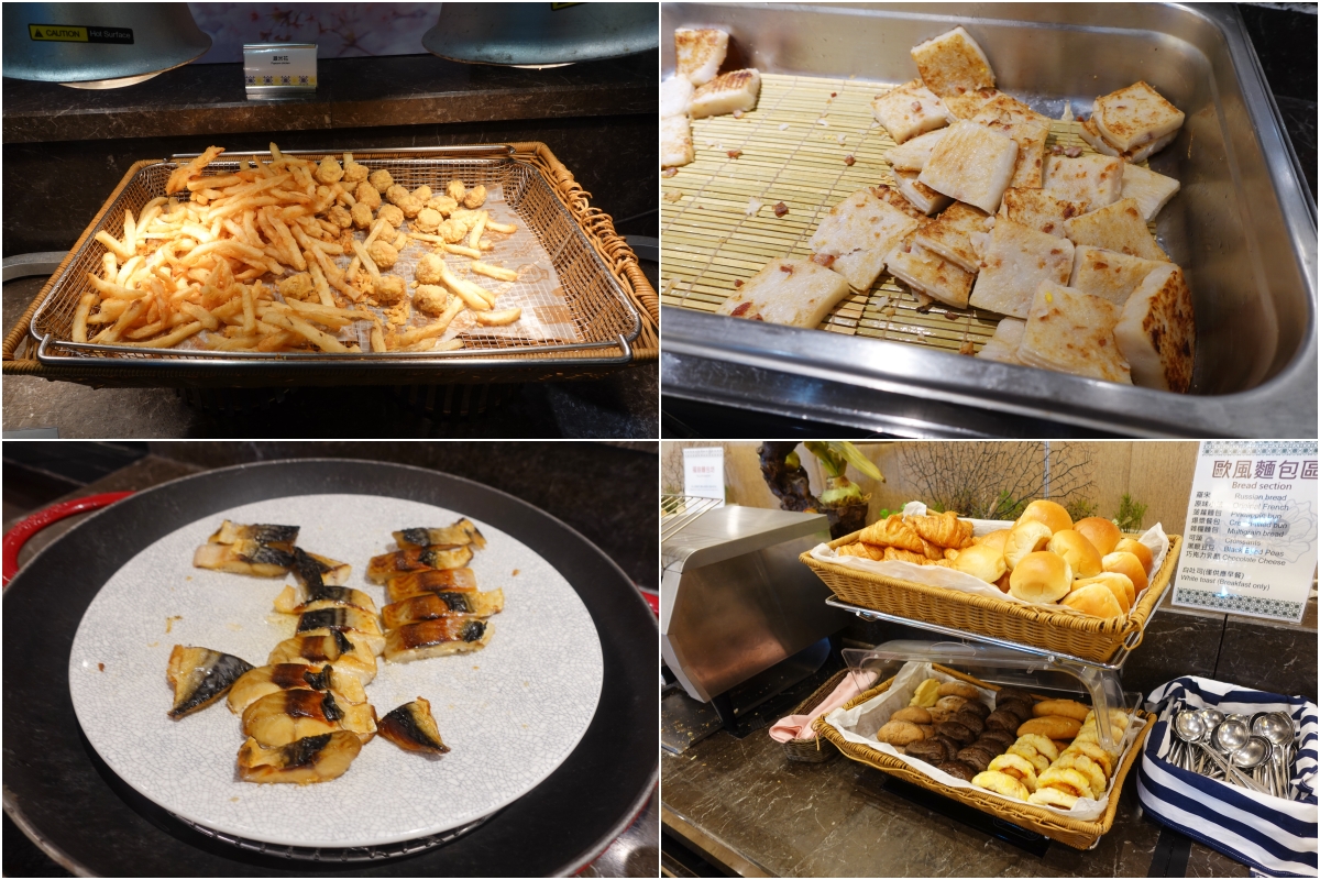 蘿蔔糕、烤鯖魚、炸物,多種歐風麵包。