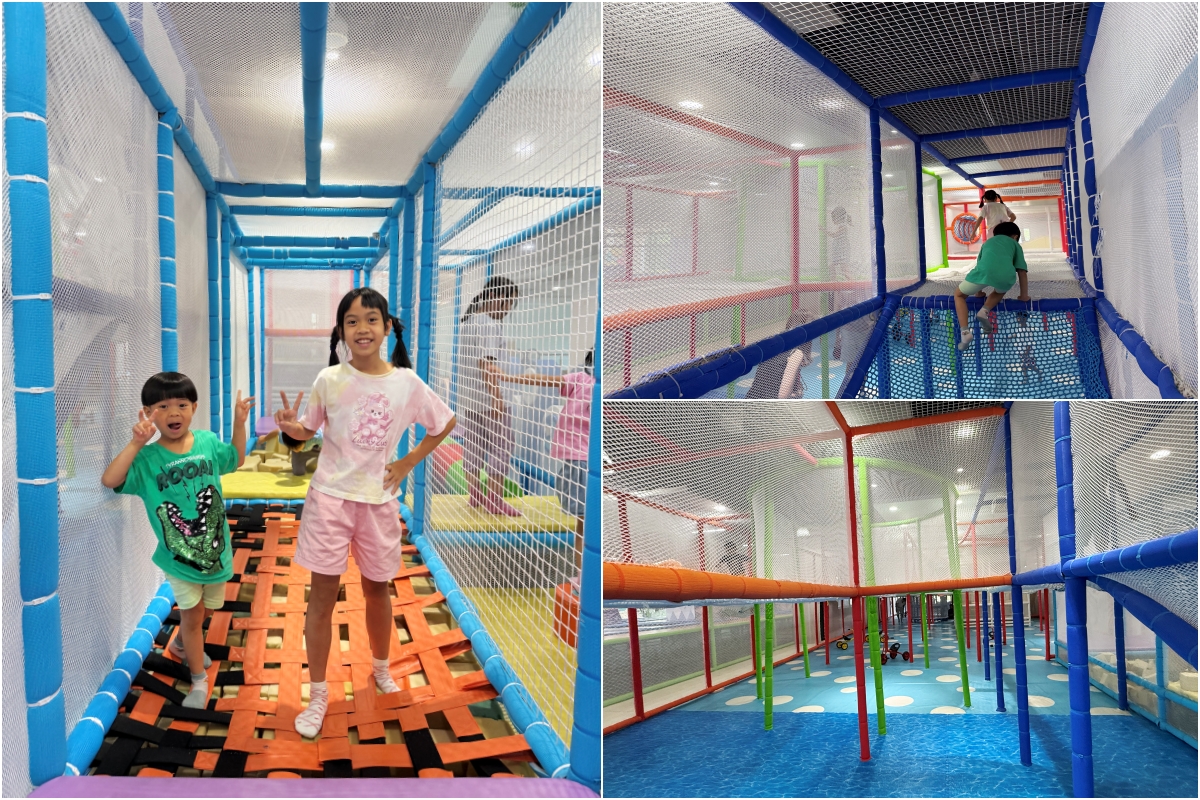 裡面有攀爬迷宮、爬行區、棒棒糖平衡木、彈跳床、阿熊溜滑梯、彩色遊具池區等,適合12歲以下兒童的各種體能式設施。