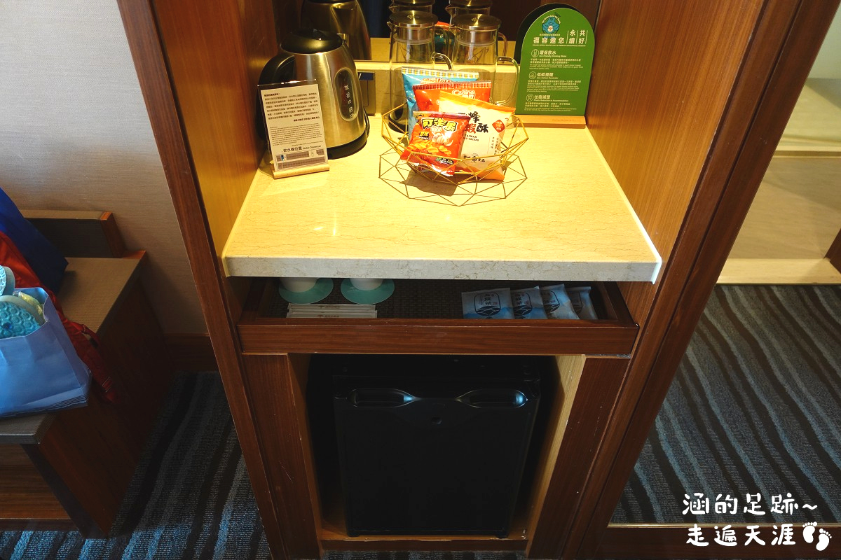 福容大飯店是環保旅店,沒有供應瓶裝水,mini bar上有水壺可以到走廊上的飲水機裝水,小涵是自己準備大的保溫瓶。
