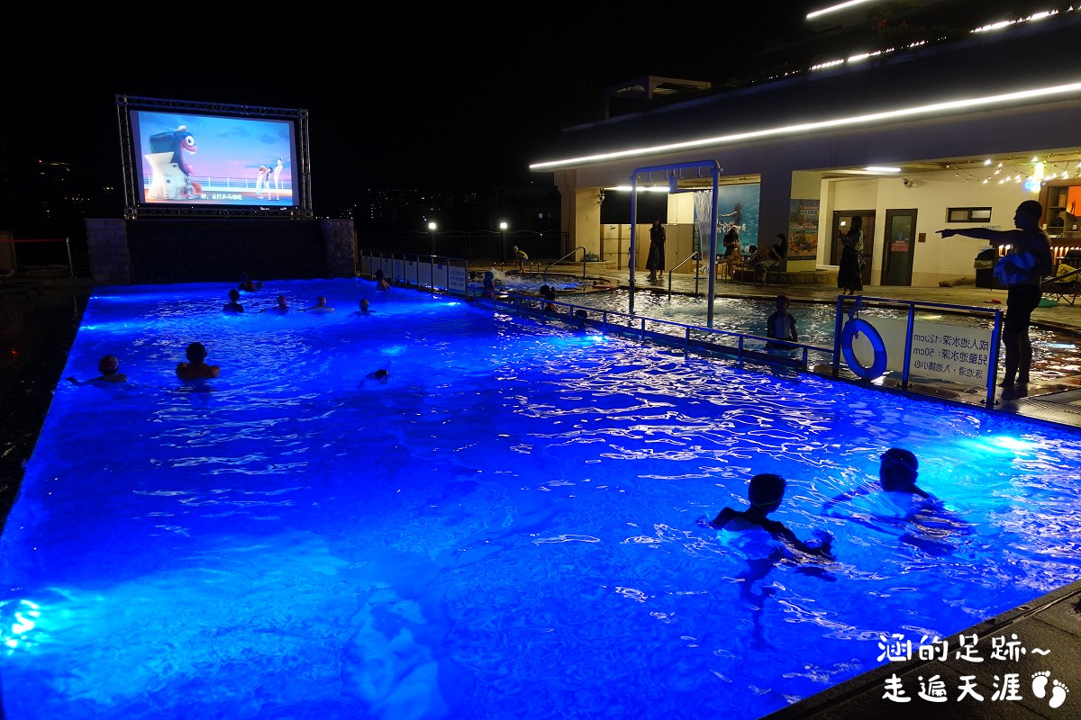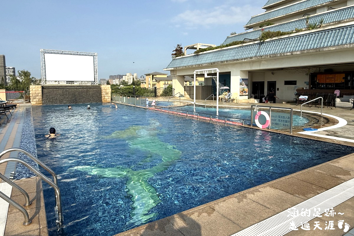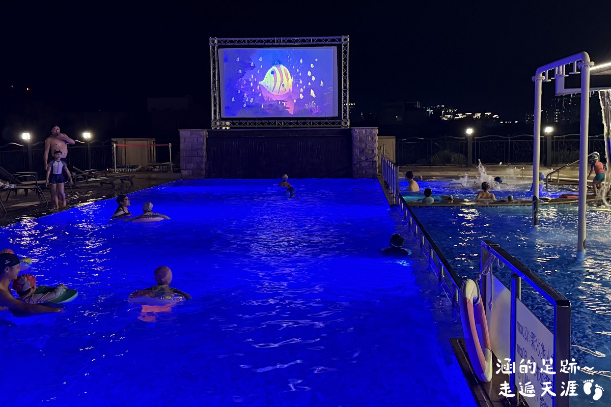 泳池旁有大螢幕,播放卡通動畫。原本我們只是來看一下,結果小朋友看到可以邊玩水游泳邊看電影,馬上吵著要換泳裝來玩水。