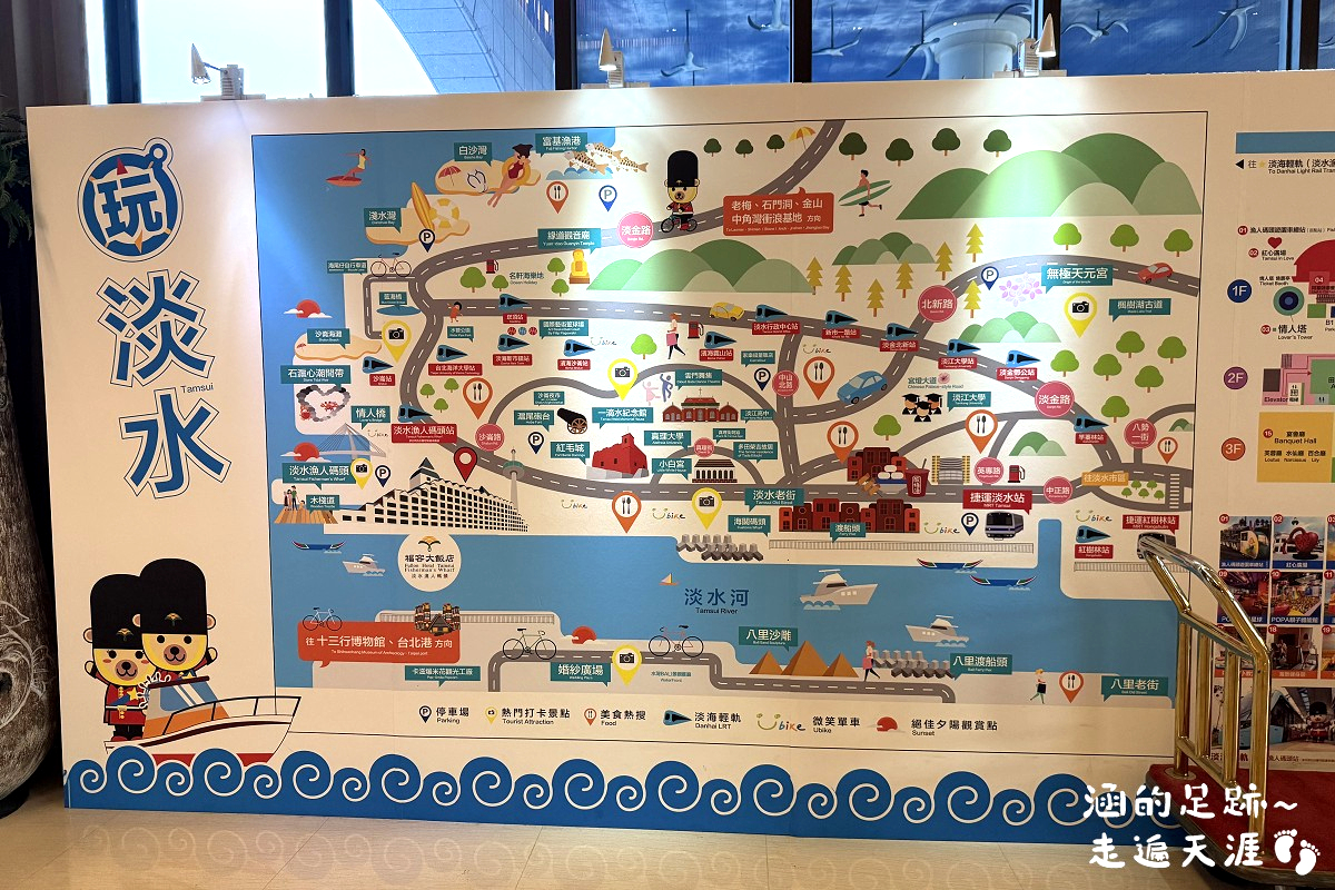 飯店大廳有一張玩淡水的觀光地圖,淡水必去的淡水老街、紅毛城、渡船頭、小白宮、滬尾砲台、八里等通通都列在上面,這一帶的觀光景點很多。