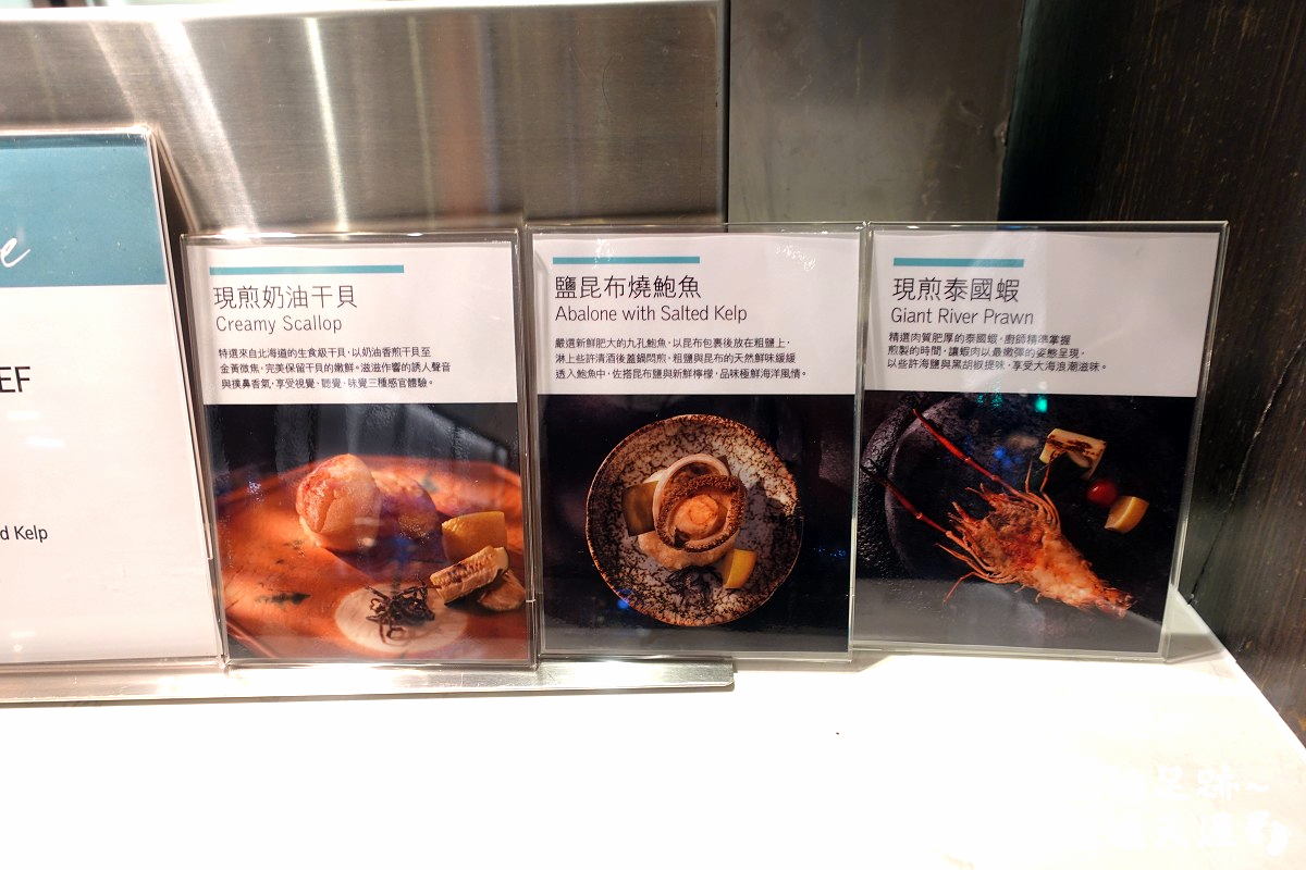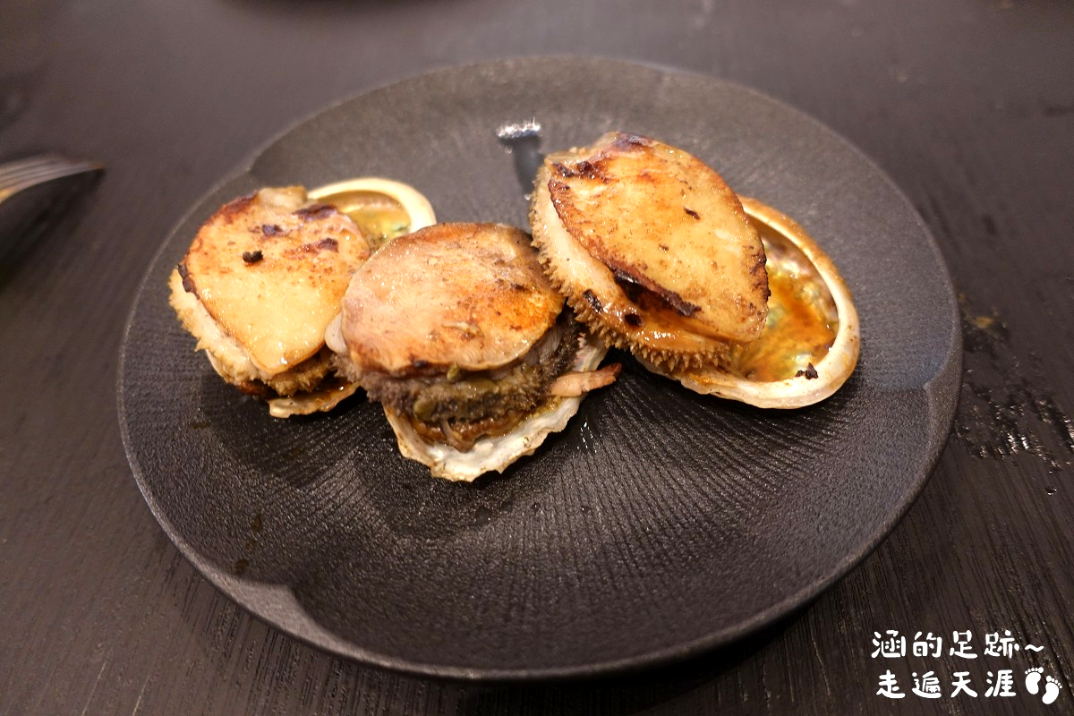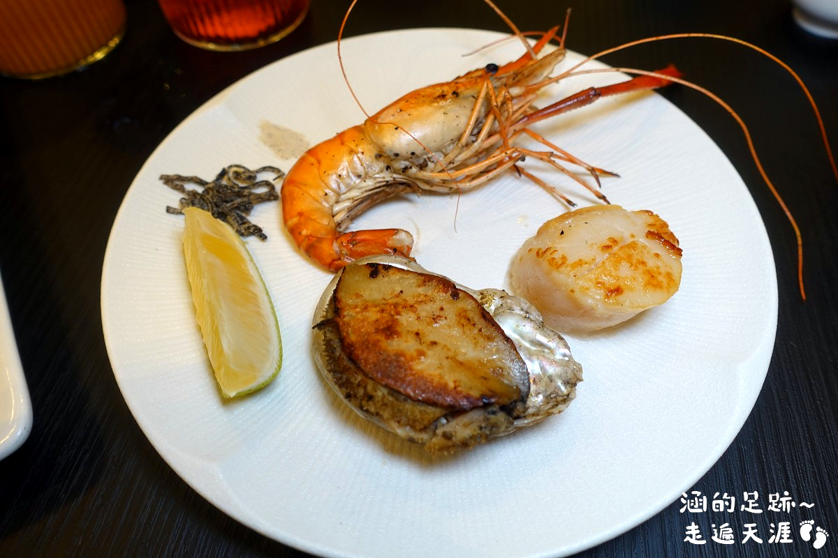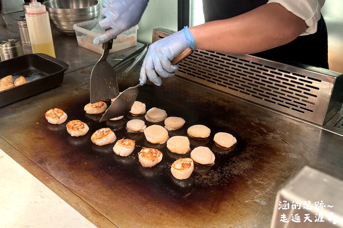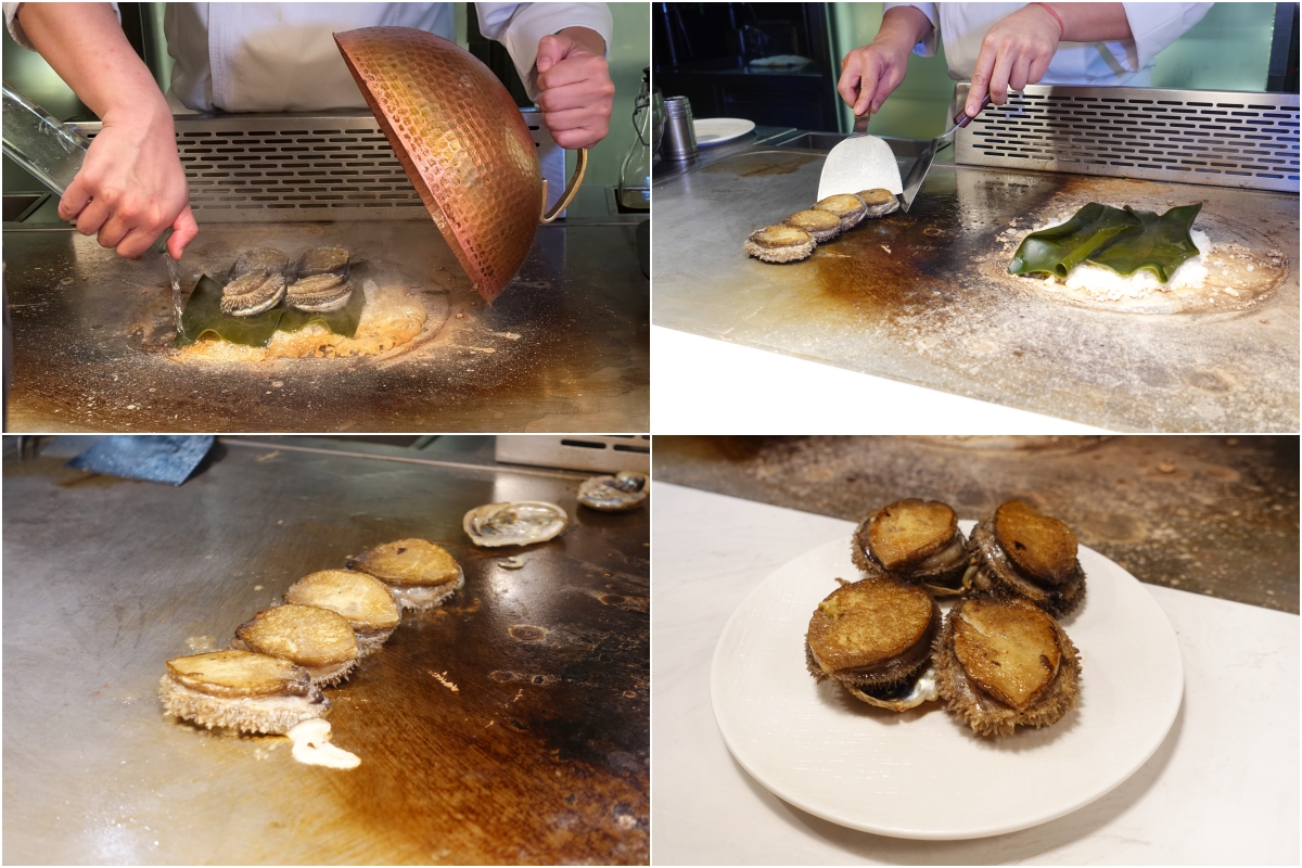 鐵板檯提供現煎奶油干貝、鹽昆布燒鮑魚、假日限定的現煎泰國蝦。