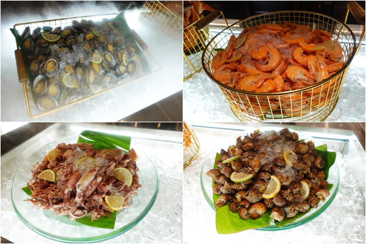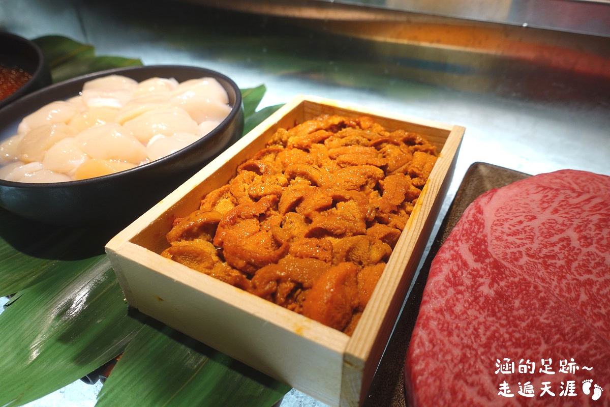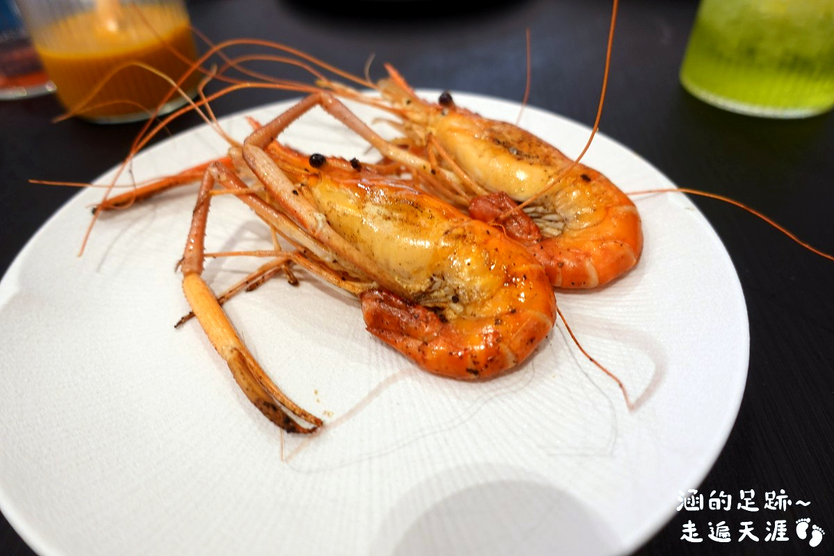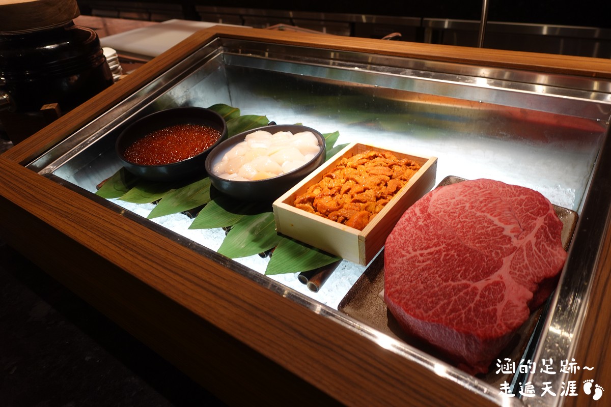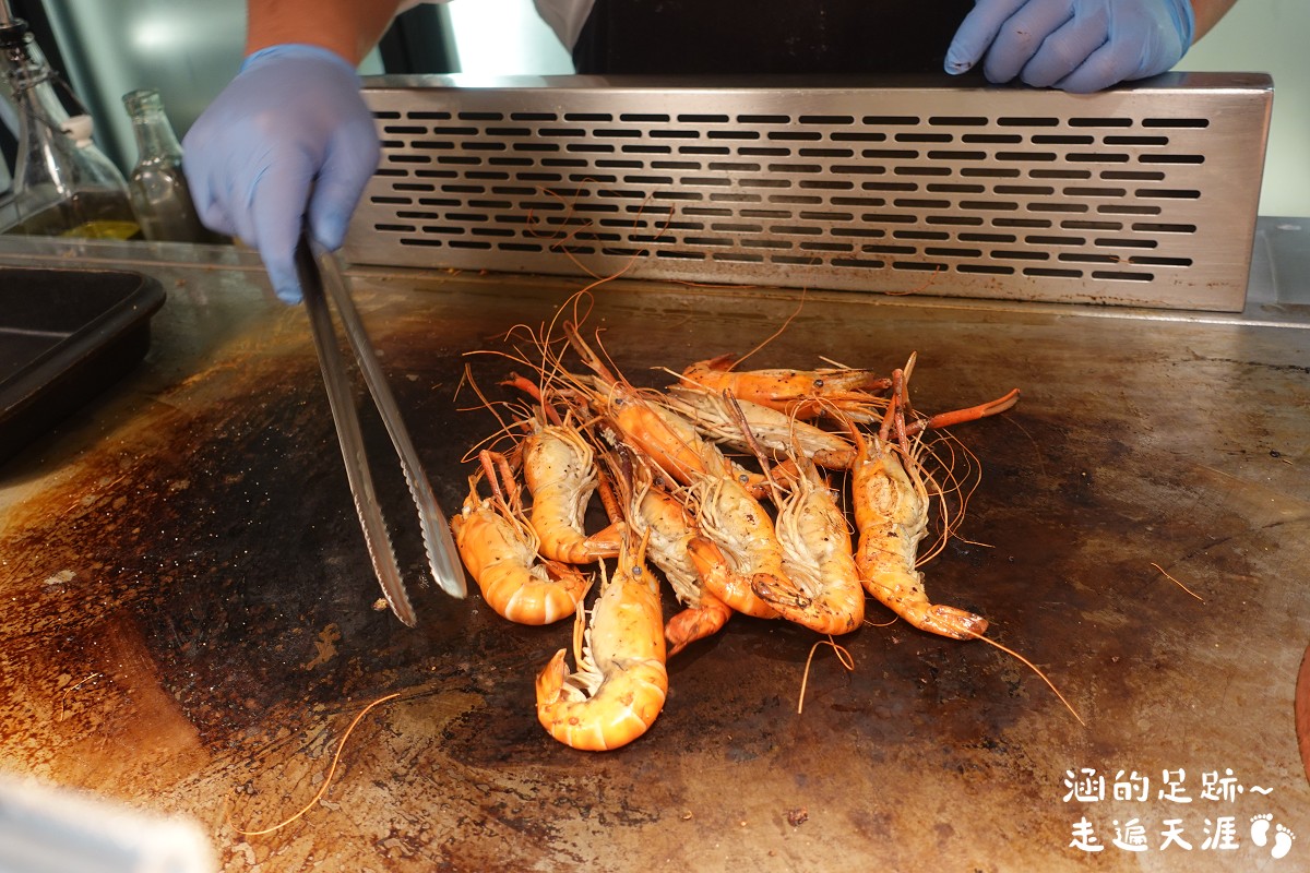 鐵板檯提供現煎奶油干貝、鹽昆布燒鮑魚、假日限定的現煎泰國蝦。