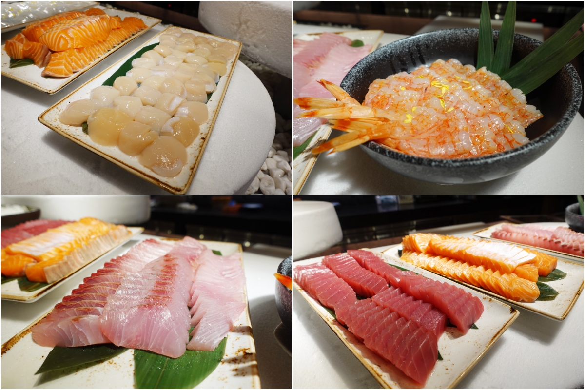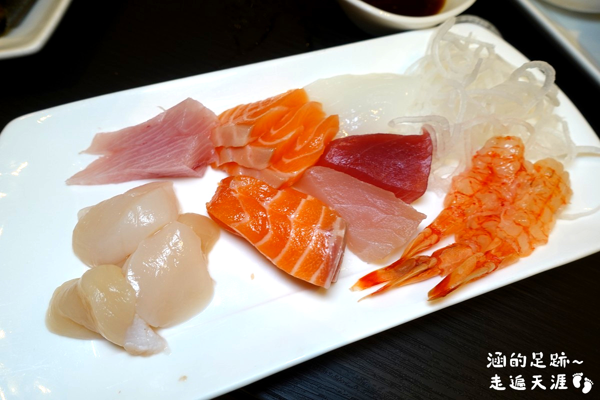 生魚片有旗魚、花枝、鮭魚、北海道干貝、鮪魚、紅甘、胭脂蝦。