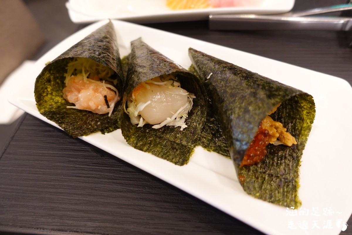 日料檯還有一大亮點就是手捲區,有三款手捲可以選,有干貝手捲、明太子手捲、假日限定推出的海膽鮭魚卵手捲。