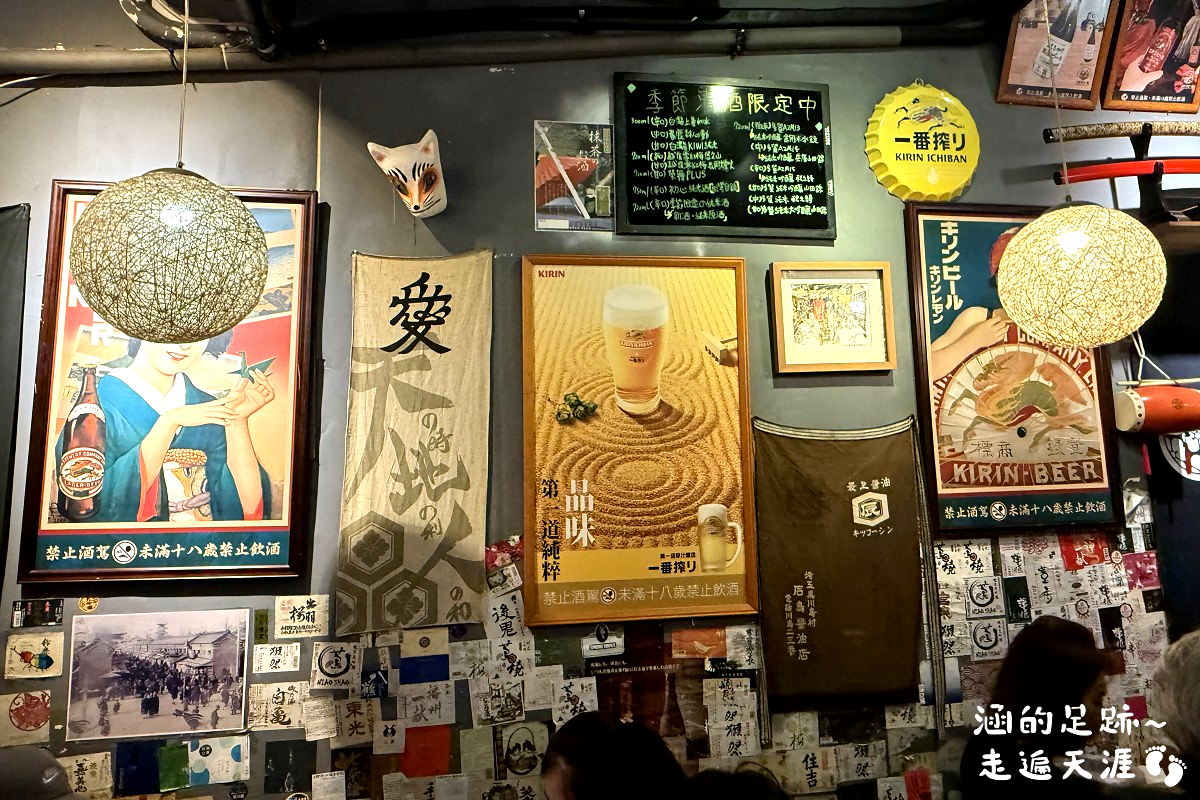 牆上有日本酒的海報和酒標,也有武士刀、德川家康、織田信長的家徽。