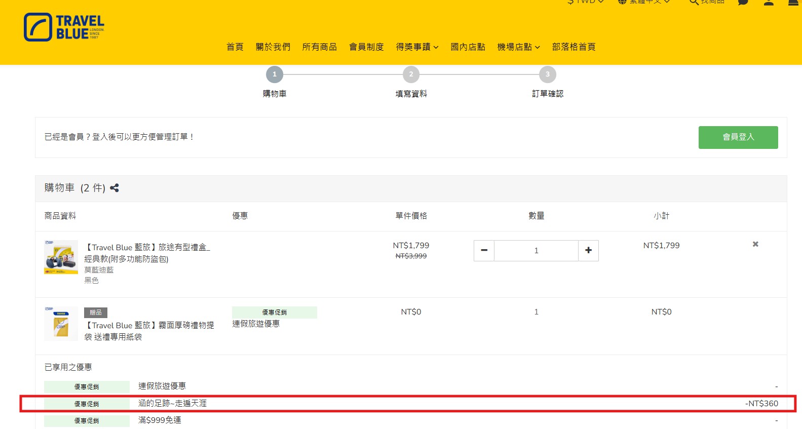 確認一下購物車裡的商品,然後最重要的是要注意下方優惠促銷的地方是否顯示”涵的足跡~走遍天涯” ,以及右方的折扣金額 (下方紅色圈起處)。