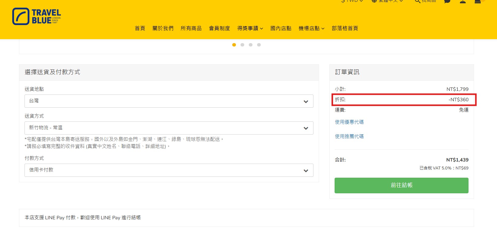 確認沒問題就可以結帳囉! 藍旅官網消費滿$999元免運費。