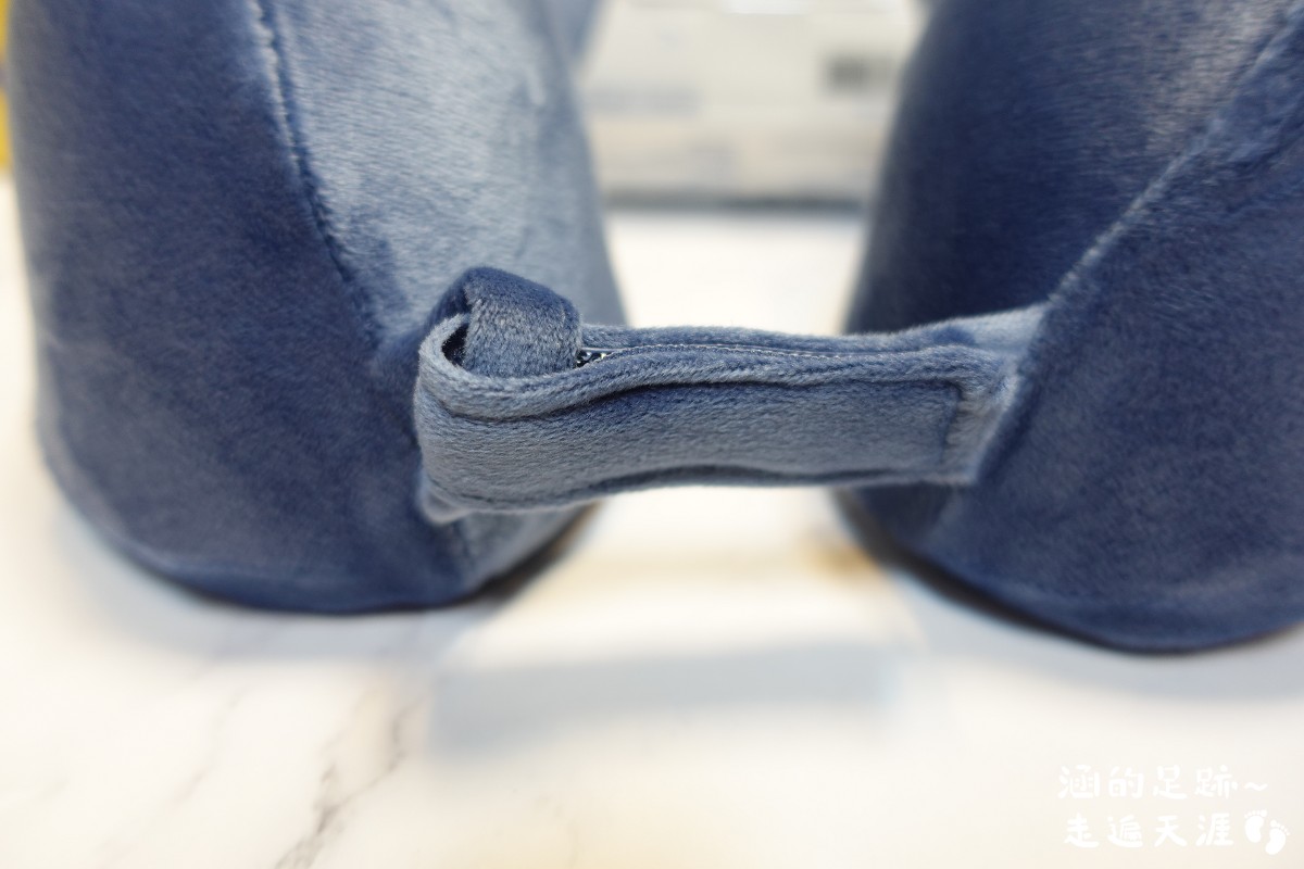 Travel Blue寧靜頸枕的表面是親膚透氣的天鵝絨面料,摸起來很舒服。將頸枕後方的拉鍊拉開,裡面是記憶棉,當頸枕的天鵝絨髒了可以將記憶棉取出,方面拆洗。