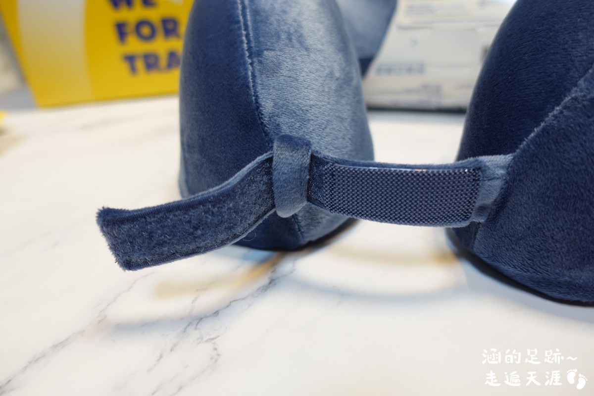 頸枕的下方有魔鬼氈,將頸枕左右兩邊連起來,可以避免使用時頸枕從脖子滑落,也方便將頸枕掛在背包或登機箱上。