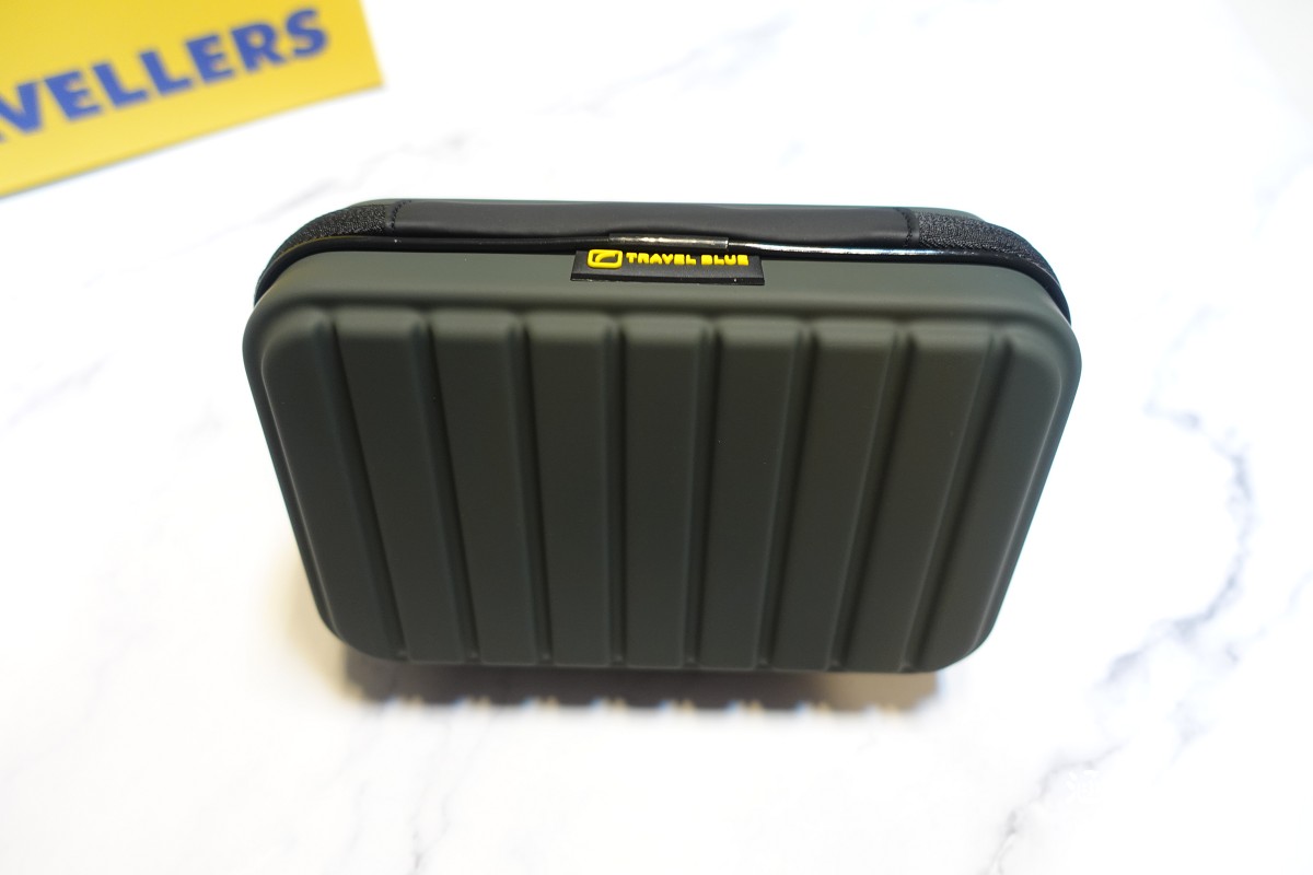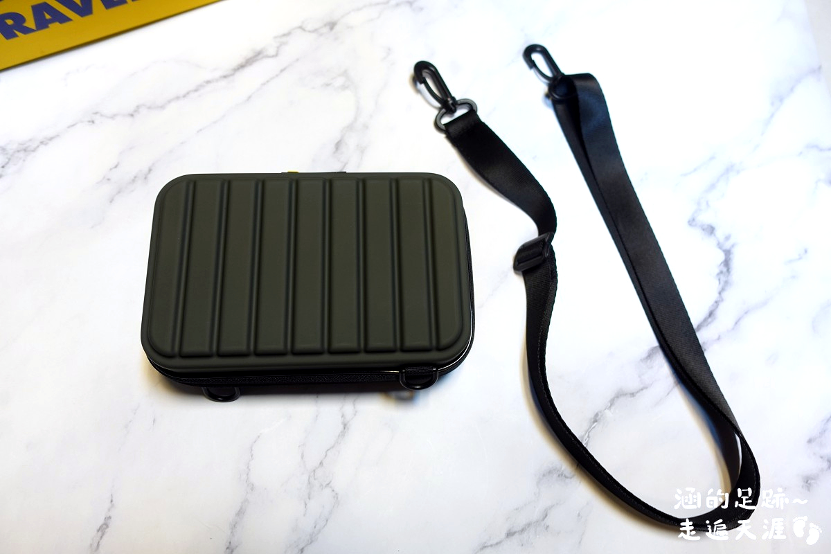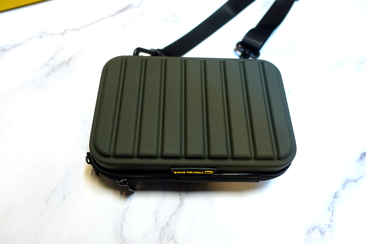 這款斜背包是硬殼設計,摸起來很滑順,觸感很棒,黑底黃字的Travel Blue logo很好看。