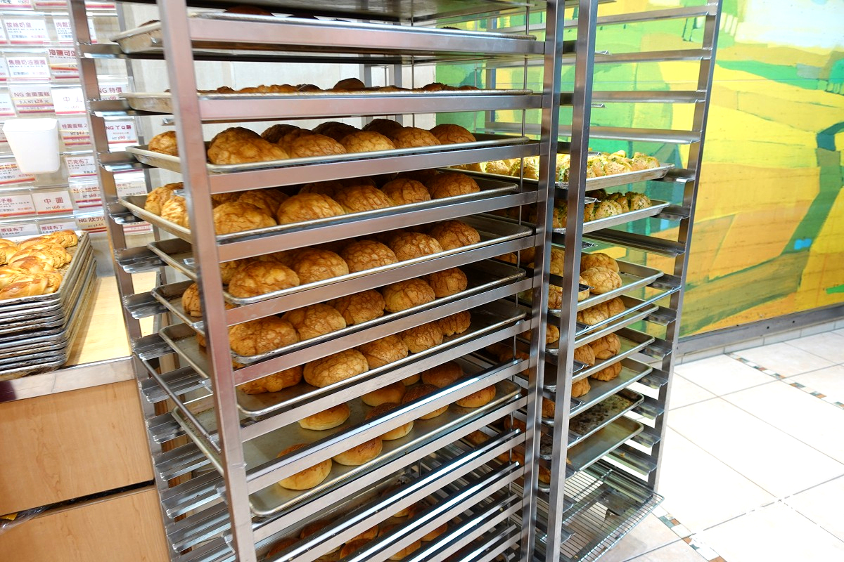 一車車的麵包從裡面推出來,這裡的麵包會一直出爐,所以很新鮮。